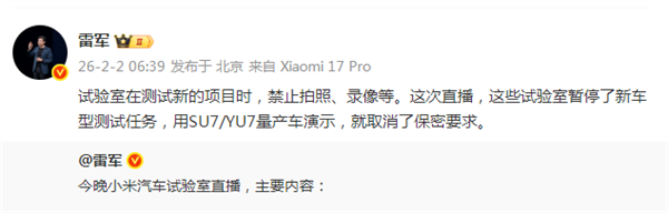 2月2日一早,雷军专门发文对此作出回应:试验室在测试新的项目时,禁止拍照、录像等。这次直播,这些试验室暂停了新车型测试任务,用SU7/YU7量产车演示,就取消了保密要求。