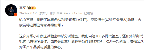 此外,他还发文表示:这次直播,我请了陈赛虎(试验验证部总经理)、李毅博士(试验室负责人)助播,大家觉得这两位专家讲得如何?