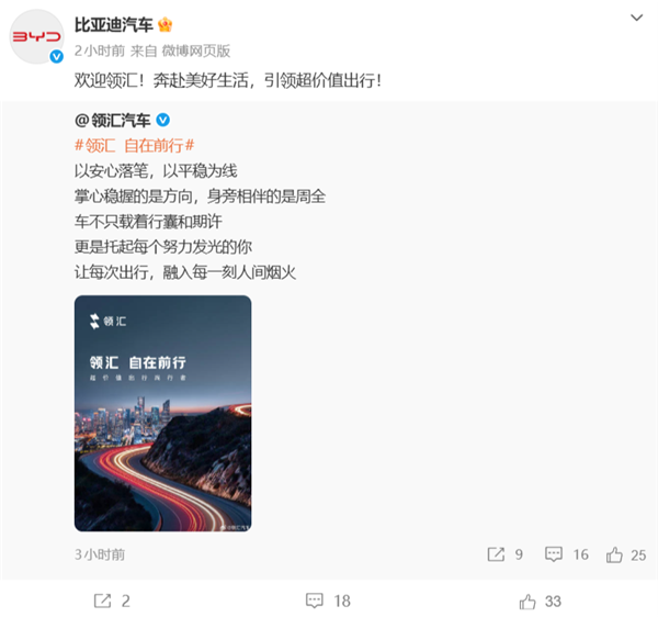 比亚迪汽车与领汇汽车官微互动表示:"欢迎领汇!奔赴美好生活,引领超价值出行!"