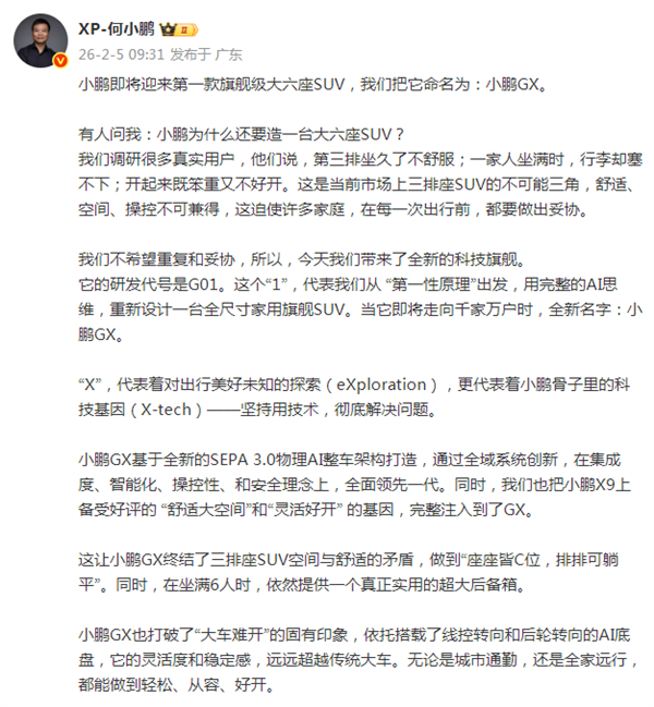 拒绝让用户妥协!何小鹏官宣小鹏首款AI新豪华大六座SUV:小鹏GX