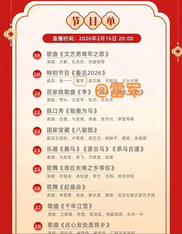不过目前马年春晚官方尚未发布正式节目单,具体信息仍需以官方发布为准。