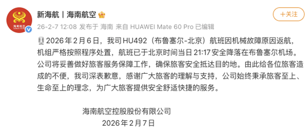 而在客机发生故障后,海南航空也发布了情况说明,2月6日,我司HU492(布鲁塞尔-北京)航班因机械故障原因返航,机组严格按照程序处置,航班已于北京时间当日21:17安全降落在布鲁塞尔机场。公司将妥善做好旅客服务保障工作,确保旅客安全抵达目的地。
