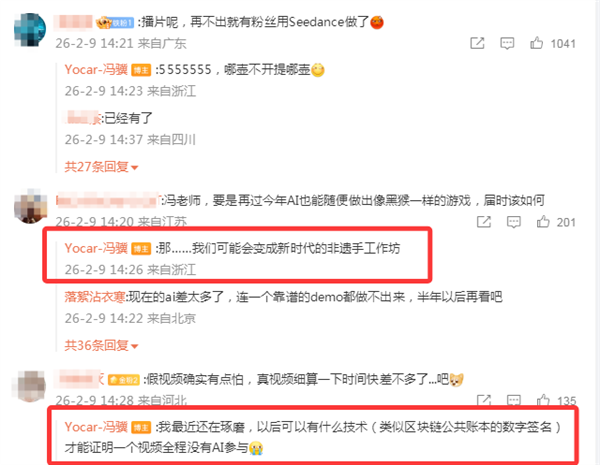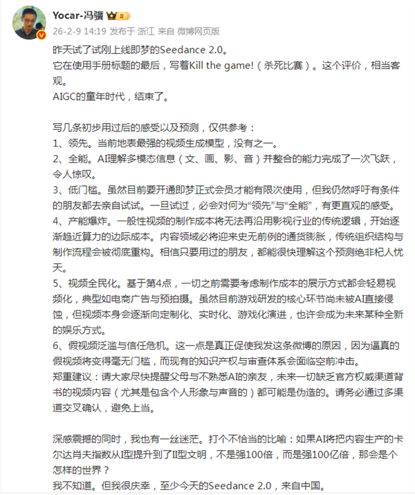 在此之前,游戏科学创始人、CEO,《黑神话:悟空》制作人冯骥也已公开力挺 Seedance 2.0。