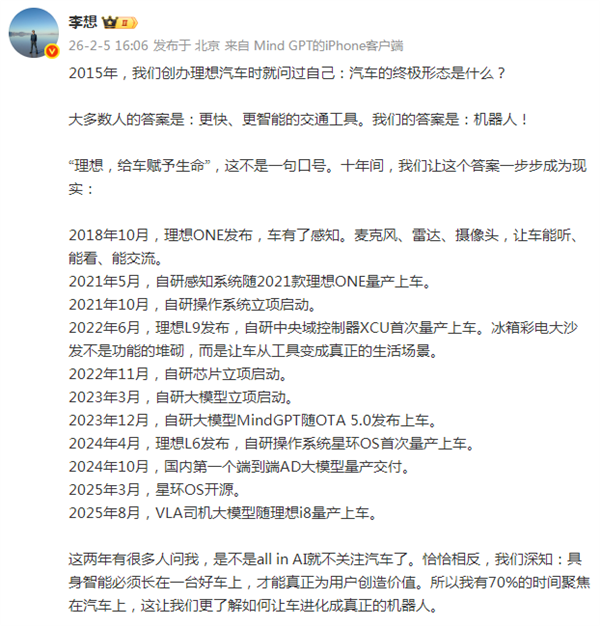 这一系列布局也引发了外界的广泛关注。2月5日,李想还在社交平台发布长文,回应了外界的疑问:"这两年有很多人问我,是不是All in AI就不关注汽车了。"