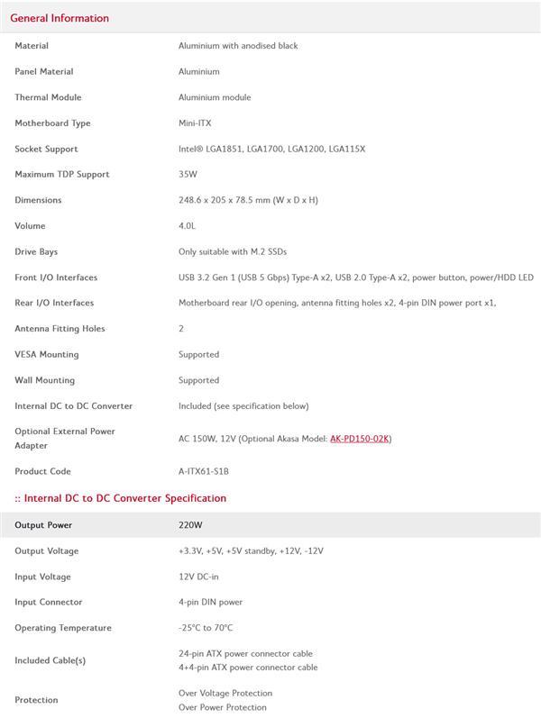 机箱前面板有2个5Gbps USB-A、2个USB 2.0接口、背部则有一个220W的DC电源插孔,通过内置转换器连接ITX主板的电源接口上。