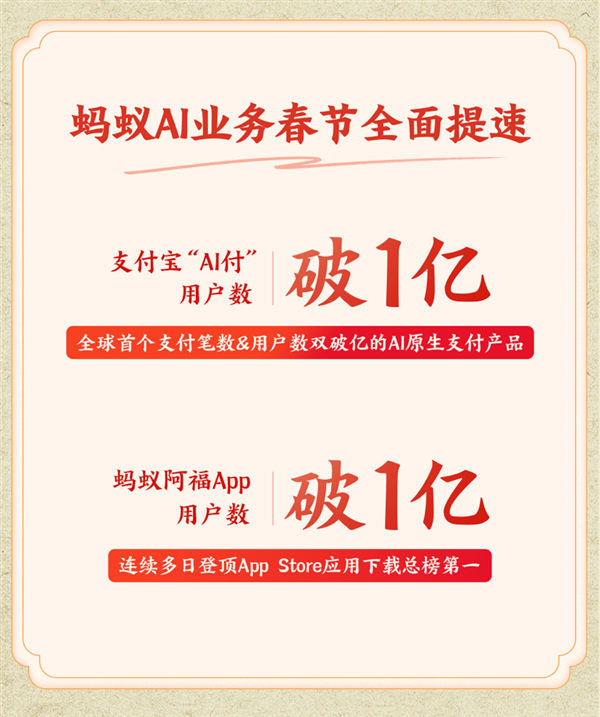 有钱花、有命花火了!蚂蚁AI业务春节全面爆发:支付宝AI付、蚂蚁阿福APP用户数双破亿