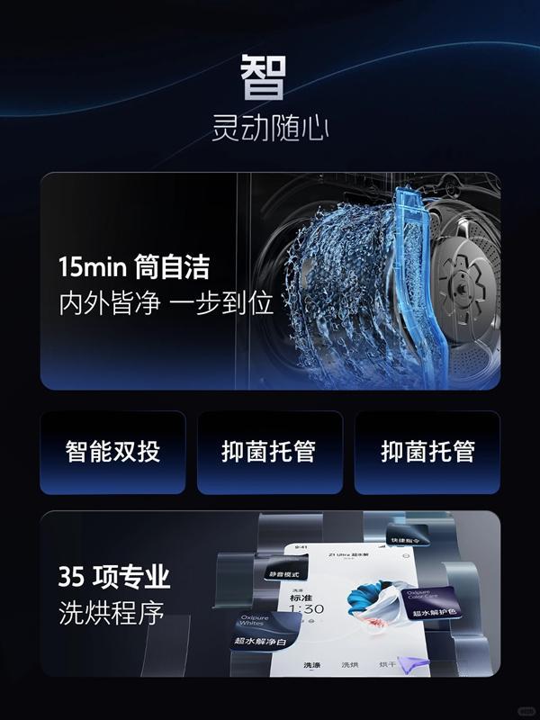 Z1 Ultra深度整合了智能生态。其提供覆盖日常清洁、高端面料、特定场景的超35种洗烘护程序,并通过智能投放精准控制洗剂用量。
