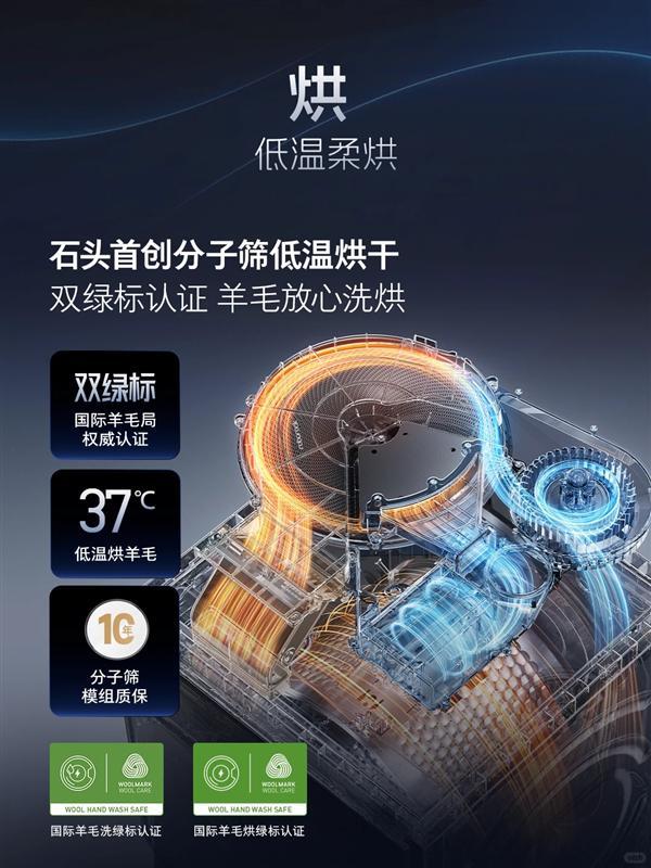 烘干环节是检验一台洗烘一体机是否真正懂衣物的关键。传统高温烘干是羊毛、真丝、羽绒等娇贵面料的天敌。Z1 Ultra突破行业瓶颈,搭载了石头独家研发的分子筛低温烘干技术。