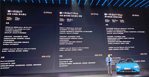 3月20日消息,新一代SU7已经正式发布,依然分了标准版、Pro版和Max版本,定价为21.99万元、24.99万元和30.39万元。