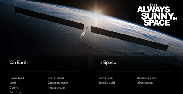 为什么太空是破局的关键?答案藏在能源里,太空里有近乎无限的太阳能,没有大气层遮挡,发电效率是地面的数倍;同时,太空的低温、真空环境也更适合芯片运行,能进一步降低算力能耗。