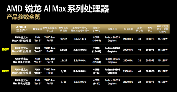 锐龙AI Max 300系列原本只有三款型号,如今迎来了两名新成员,分别是锐龙AI Max+ 399、锐龙AI Max+ 388,更适合高端超轻薄笔记本,甚至是小尺寸台式机、迷你主机。