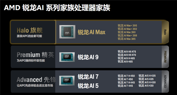 锐龙AI 400系列则完整覆盖高端精英人群、主流先锋人群,前者是锐龙AI 9系列,后者则是锐龙AI 7/5系列。