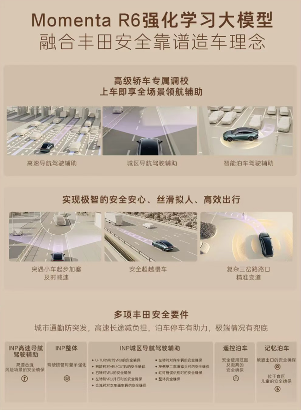辅助驾驶部分,该车搭载Momenta方案,采用一体融合式的端到端大模型,支持城市与高速的高阶辅助驾驶。