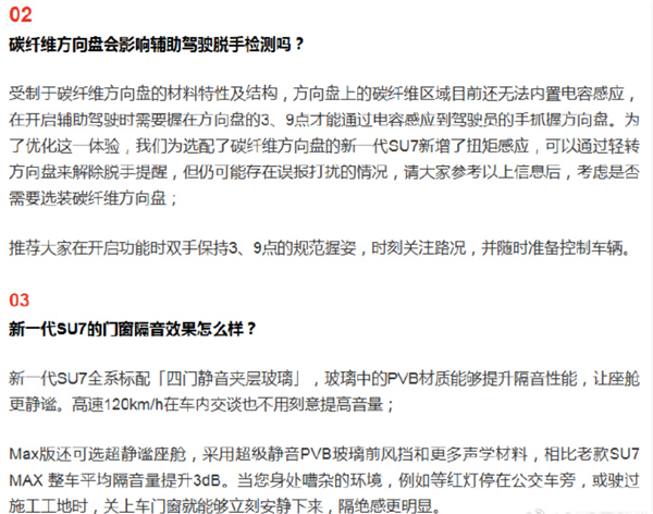 4月1日消息,针对用户关心的碳纤维方向盘是否影响脱手检测,以及车辆隔音性能等热点问题,小米汽车近期给出了详细的技术说明与回应。
