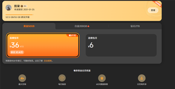 黄金50GB连续包年:36元,折合每月约2.4元;