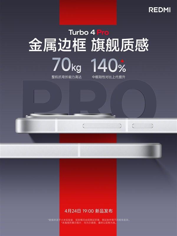 除了屏幕之外,Turbo 4 Pro还升级了旗舰金属中框,采用CNC+喷砂工艺,质感更强、更耐用,抗弯折能力高达70kg,推动2.5K档以上淘汰塑料中框。