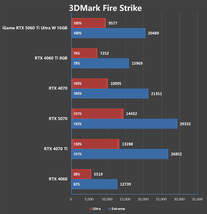 2K分辨率3DMark Fire Strike Extreme测试中,iGame RTX 5060 Ti Ultra W 16GB图形分数20489分,核心运行最高频率为2902MHz,整卡最高功耗182W。