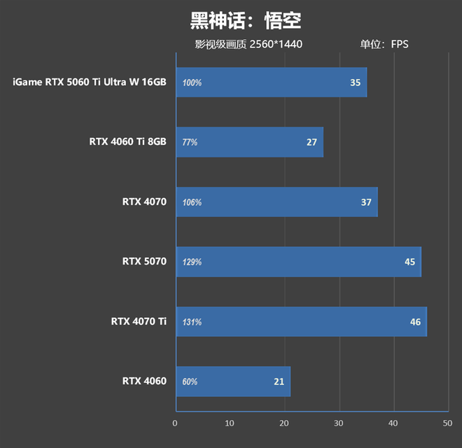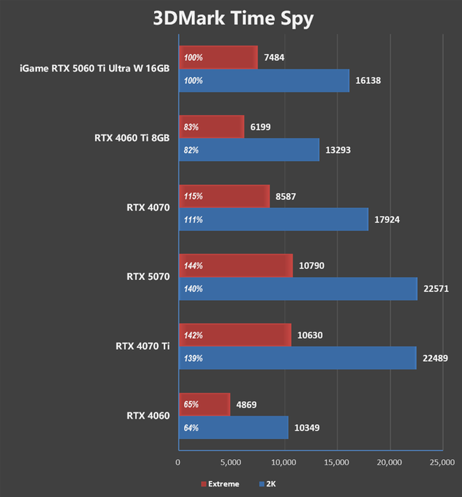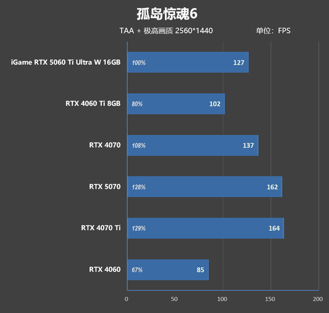 在性能方面,iGame RTX 5060 Ti Ultra W 16GB的加速频率比公版高了60MHz,其实际游戏性能比起上代的RTX 4060 Ti 8GB要强了25%左右,稍弱于RTX 4070。