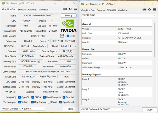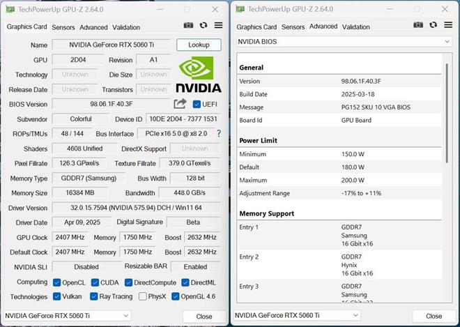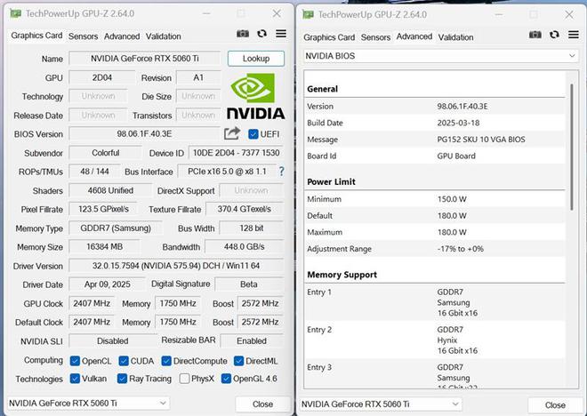 在性能方面,iGame RTX 5060 Ti Ultra W DUO 16GB OC有2个BIOS,默认BIOS的参数与公版完全相同的,基础频率2407MHz,加速频率2572MHz,TGP 锁死180W。
