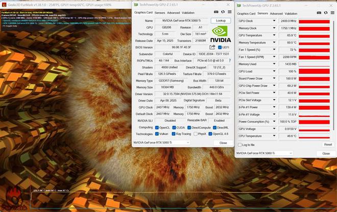Furmark的参数设定为1920*1080分辨率、0AA。运行16分钟之后,iGame RTX 5060 Ti Ultra W 16GB的温度稳定在66度,功耗180W,风扇转速2299RPM。