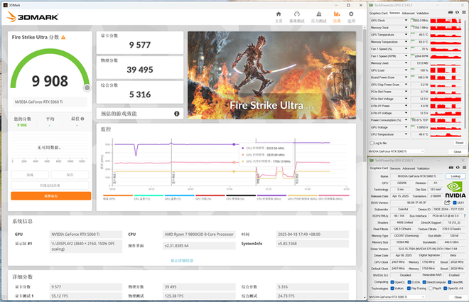 在4K分辨率3DMark Fire Strike Ultra测试中,iGame RTX 5060 Ti Ultra W 16GB图形分数为9577分,核心运行最高频率为2902MHz,最高功耗187W。