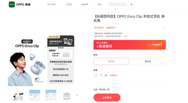 OPPO商城显示,OPPOEnco Clip是孙颖莎同款耳机,可选星岩灰、珠光海两款配色。