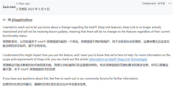 据Intel员工Zack-Intel在GitHub上的回应,Deep Link技术将不再获得任何未来的更新。