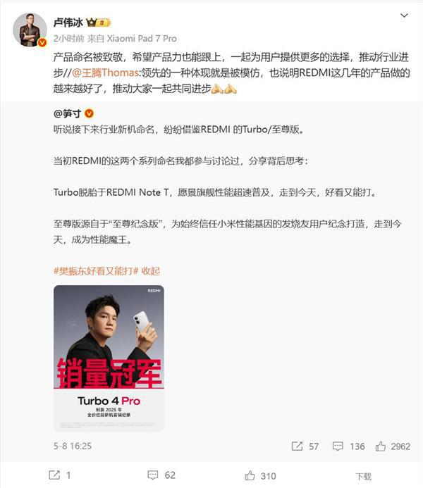 REDMI产品名被友商致敬 卢伟冰喊话:希望产品力也能跟上