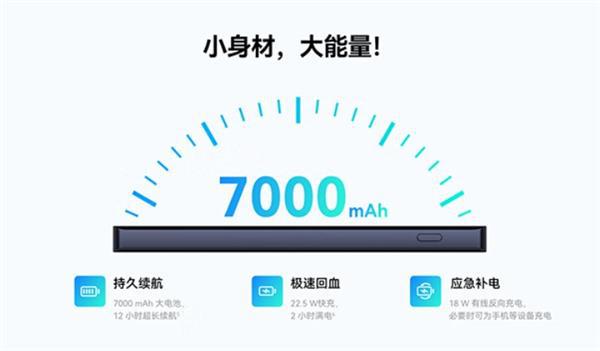 机身内置7000mAh电池,可实现12小时续航,支持22.5W快充,还支持18W反向充电,可以给手机等设备补电。