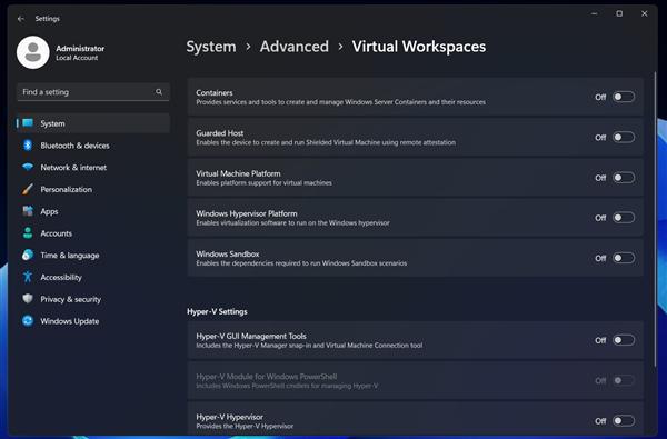 除了"长路径"开关,新的"高级设置"页面还提供了管理"虚拟工作区"的功能,允许用户在PC上创建隔离的虚拟环境,从而更安全地运行虚拟机、容器或隔离环境。