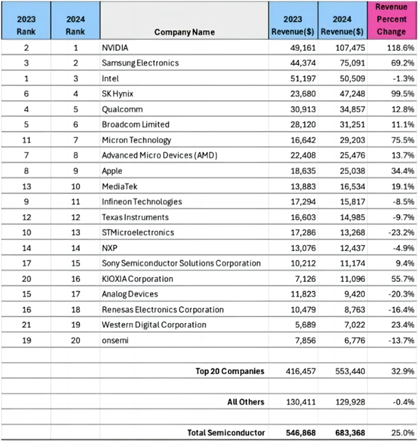 内存需求的激增也使得制造商受益,三星、SK海力士和美光在2024年均跻身前七大公司之列。