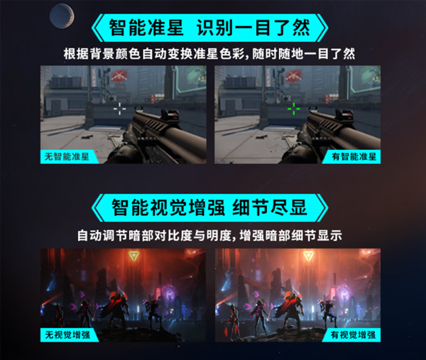 针对游戏痛点,微星还开发三大AI智能功能,包括动态准星变色系统、暗部场景智能提升、智能局部监测护屏。
