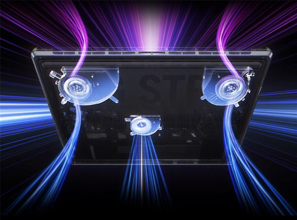 这背后提供支撑的是冰川散热架构3.0,包括三个内吹风扇、七条热管、373片174183平方毫米的0.1毫米冰翼鳍片,当然也少不了风扇防尘网、键盘进风孔位、智能降噪等技术。