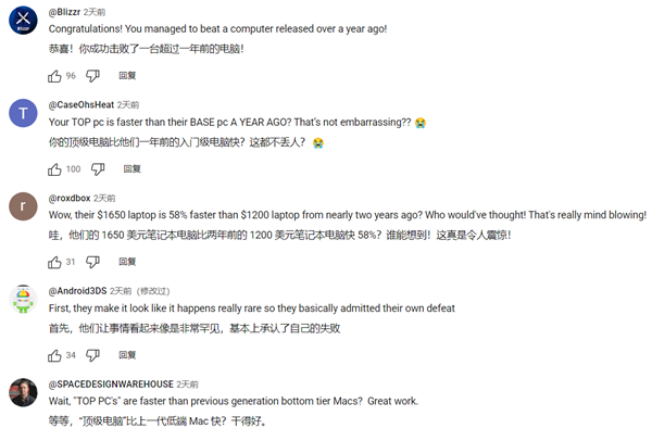 还有网友指出:"哇,他们那台1650美元的笔记本比将近两年前的1200美元笔记本快了58%?谁能想到呢!真是太令人震惊了!"