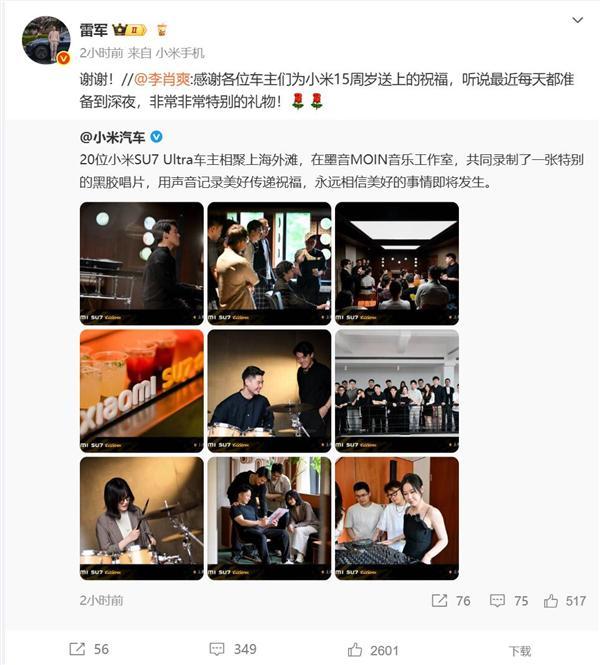 小米创办人雷军、小米汽车副总裁李肖爽转发了这条微博并感谢,李肖爽表示,感谢各位车主们为小米15周岁送上的祝福,听说最近每天都准备到深夜,非常非常特别的礼物。