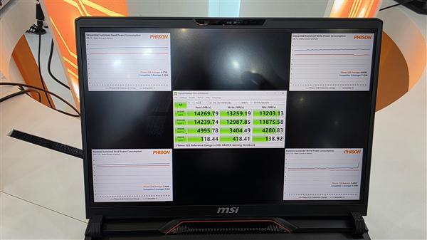 群联现场展示的参考设计平台采用了锐龙7 9700X处理器、ROG CROSSHAIR X870E主板,实测顺序读写速度达到了14.9GB/s、14.1GB/s,超过了官方标称。