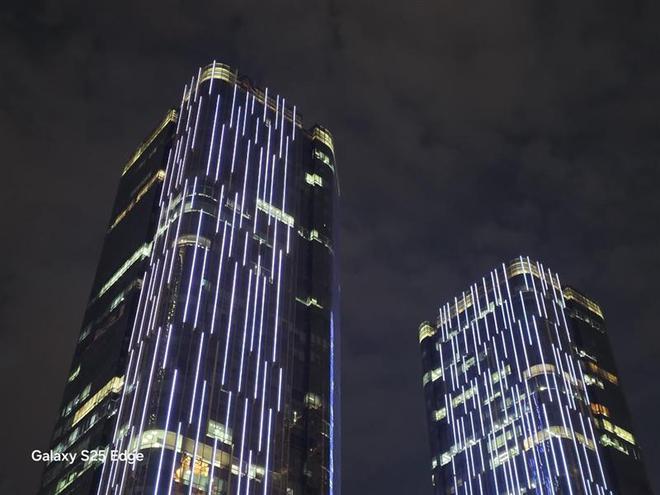 在夜间场景下,三星Galaxy S25 Edge的这枚主摄在色彩能力的战线上,可以精准还原灯光与环境色调,建筑蓝光、灯牌暖黄都浓郁且自然;光影效果突出,亮部不过曝、暗部保留细节,灯光轮廓与建筑层次分明。