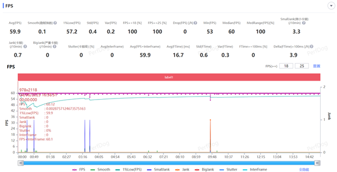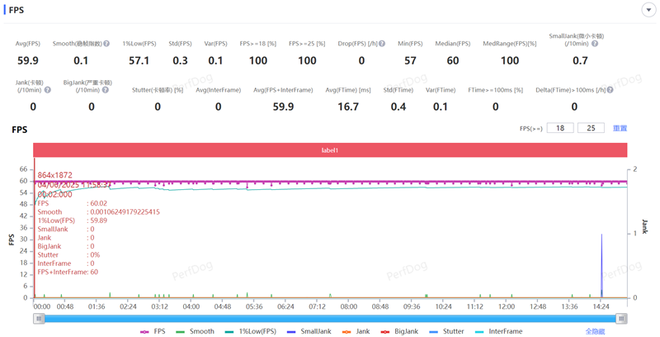原神手游在开启最高画质+60模式下,进行15分钟的须弥城跑图测试,游戏帧率稳如一条直线,平均帧率59.9FPS,平均波动为0.1,虽然手机轻薄,但高负载游戏的性能释放还是相当稳定的。
