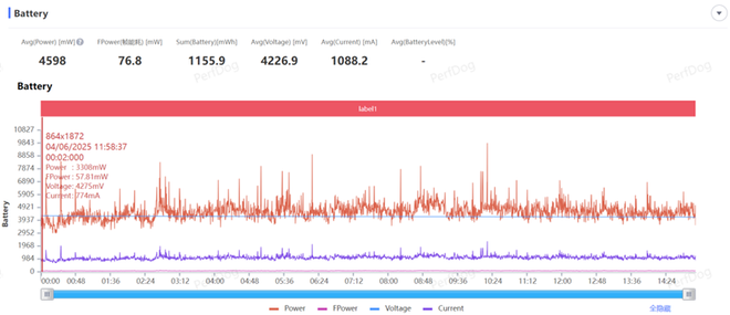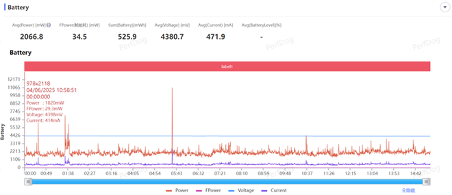 游戏的平均功耗为4.598W,功耗相比S25 Ultra略高一点,能效比为13.03FPS/W。