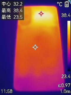 游戏过后,机身背面堆高温度为38.4摄氏度。