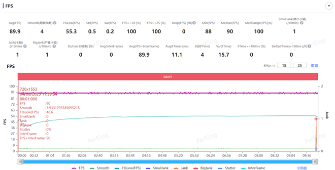 和平精英手游,在HDR高清画质下可开启90帧模式,一局激烈的枪战过后,游戏的平均帧率稳定在了89.9FPS。
