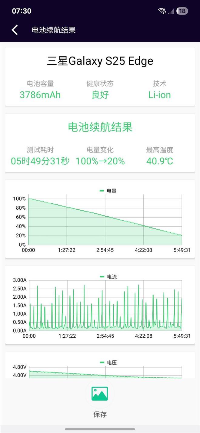 经过电池狗狗的不间断测试,三星Galaxy S25 Edge的电量从100%测试至20%,续航时长为5小时49分31秒,经过折算,满电续航时长大约在7小时左右,间歇性使用的话,大概能用个大半天。