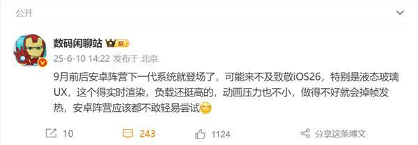 他还表示,iOS 26的液态玻璃设计需要实时渲染,负载挺高,动画压力也不小,做得不好就会掉帧发热,安卓厂商应该不敢轻易尝试。